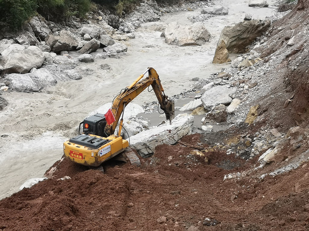 截止8月26日,崇州雞冠山受災路段4號點位(K22+260)及5號點位(K22+805)已全面搶通,達到機械設(shè)備、車輛可以通過條件。同時,為增強兩處通行能力,分別在4號點位采取鉛絲籠加固便道及邊坡,5號點位對路基進行填筑加高。26日下午,11號點位(K25+390)已組織機械設(shè)備進場進行便道路基修筑。