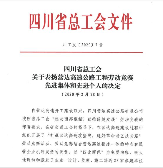 近日,營(yíng)達(dá)高速公路建設(shè)勞動(dòng)競(jìng)賽得到四川省總工會(huì)的表?yè)P(yáng),集團(tuán)董事長(zhǎng)謝應(yīng)文等先進(jìn)個(gè)人和集體獲省“五一勞動(dòng)獎(jiǎng)?wù)?rdquo;、“五一勞動(dòng)獎(jiǎng)狀”、“工人先鋒號(hào)”等獎(jiǎng)勵(lì)。