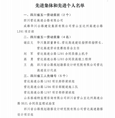 為此,省總工會(huì)特授予四川營(yíng)達(dá)高速公路有限公司、成都華川公路建設(shè)集團(tuán)有限公司營(yíng)達(dá)高速公路LJ01項(xiàng)目部2個(gè)集體“四川省五一勞動(dòng)獎(jiǎng)狀”;授予華川集團(tuán)董事長(zhǎng)、營(yíng)達(dá)高速建設(shè)指揮部指揮長(zhǎng)、營(yíng)達(dá)高速勞動(dòng)競(jìng)賽組委會(huì)主任謝應(yīng)文等四名同志“四川省五一勞動(dòng)獎(jiǎng)?wù)?rdquo;;授予營(yíng)達(dá)高速公路LJ02項(xiàng)目部橋梁班組等5個(gè)集體 “四川省工人先鋒號(hào)”;授予營(yíng)達(dá)高速公路LJ03項(xiàng)目部等5個(gè)“四川省重點(diǎn)工程勞動(dòng)競(jìng)賽先進(jìn)集體”稱(chēng)號(hào);授予甘玉平等10名同志“四川省重點(diǎn)工程勞動(dòng)競(jìng)賽優(yōu)秀建設(shè)者”稱(chēng)號(hào);授予營(yíng)達(dá)公司計(jì)量工程師唐華婧“五一巾幗標(biāo)兵崗(標(biāo)兵)”稱(chēng)號(hào)。