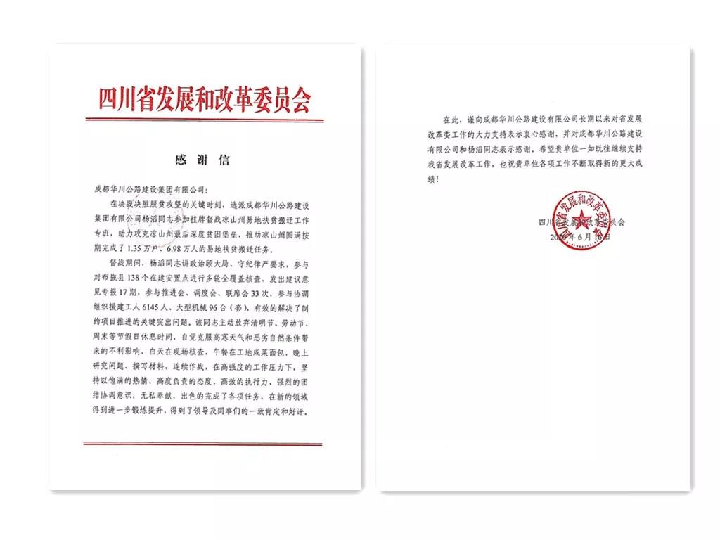 助力涼山州易地扶貧搬遷 再現(xiàn)華川人嚴(yán)格律己品質(zhì)——華川集團(tuán)獲致四川省發(fā)展和改革委員會感謝信