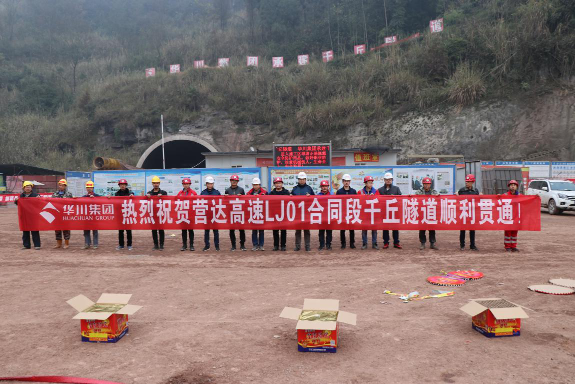 2018年12月19日12:20分,營達(dá)高速公路營達(dá)一標(biāo)千丘隧道最后一炮聲響從正在施工的隧道內(nèi)傳出,待隧道內(nèi)煙塵散去,隧道兩頭的施工工人成功“會師”,至此,營達(dá)高速公路LJ01標(biāo)第二座隧道 — 千丘隧道全線順利貫通!